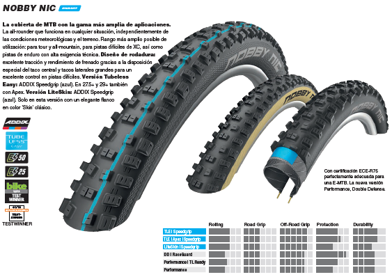 Los amantes de las travesías y el All Mountain la adoran. Se utiliza en competiciones de XC, como en competiciones de Enduro de alta exigencia técnica. El flanco SnakeSkin se incluye de serie y la hace inmune a los cortes y reventones, mientras la conversión tubeless es más fácil y segura que nunca. Nobby Nic es el mejor amigo del ciclista de